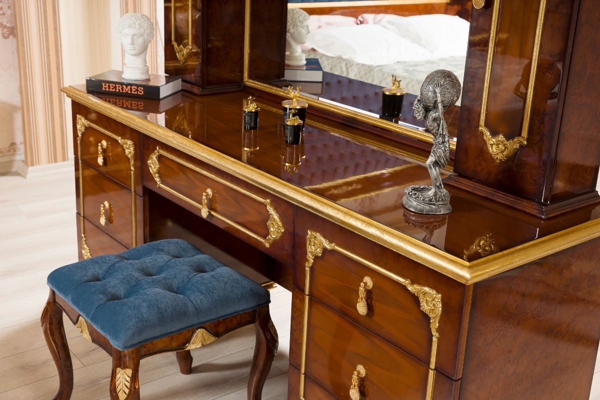 Tuvalet masası üzerindeki makyaj aynasının yan kısımları küçük parfümeri , takı ve bakım malzemelerinizi koyabilmeniz için kapaklı dolap olarak tasarlandı. Altı kapılı olarak hazırlanan dolap ceviz kaplama zemin ve altın varağın uyumu ile kombin edildi. Yatak odası takımının dolap içleri ve komodin içleri kullanıcının isteğine göre tasarlanabilir. Takımdaki tüm çekmece ve kapaklarda, çarpmalara karşı özel frenli raylar ve birinci sınıf menteşeler kullanıldı. Nilüfer lüks yatak odası tasarımları, istediğiniz ölçüde ve istediğiniz renkte hazırlanabiliyor. Nilüfer yatak odası modeli otel odası mobilyası olarak da projeye uygun şekilde üretilebiliyor.