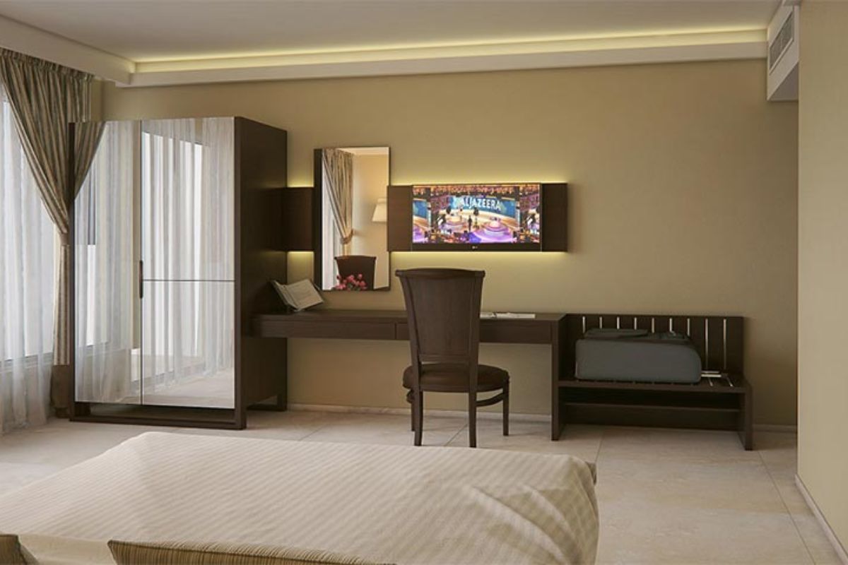 Delux otel odasında bulunan komodinler, çalışma masası, fiskos sehpa, minibar dolabı, valizlik ve gardrop da hem kullanılışlı hem de estetik bir yapıya sahip. Asortie Mobilya, otel projelerinde perde, otel halısı, otel odası kapısı, kapı kilit sistemleri, otel odası aksesuarları gibi her ihtiyacı karşılayarak sizlere anahtar teslim bir proje sunuyor. Lüks ve modern otel odası, projeleri hakkında daha fazla bilgi almak ve projelerinizi teslim etmek için, ürün bilgi formunu doldurabilirsiniz.