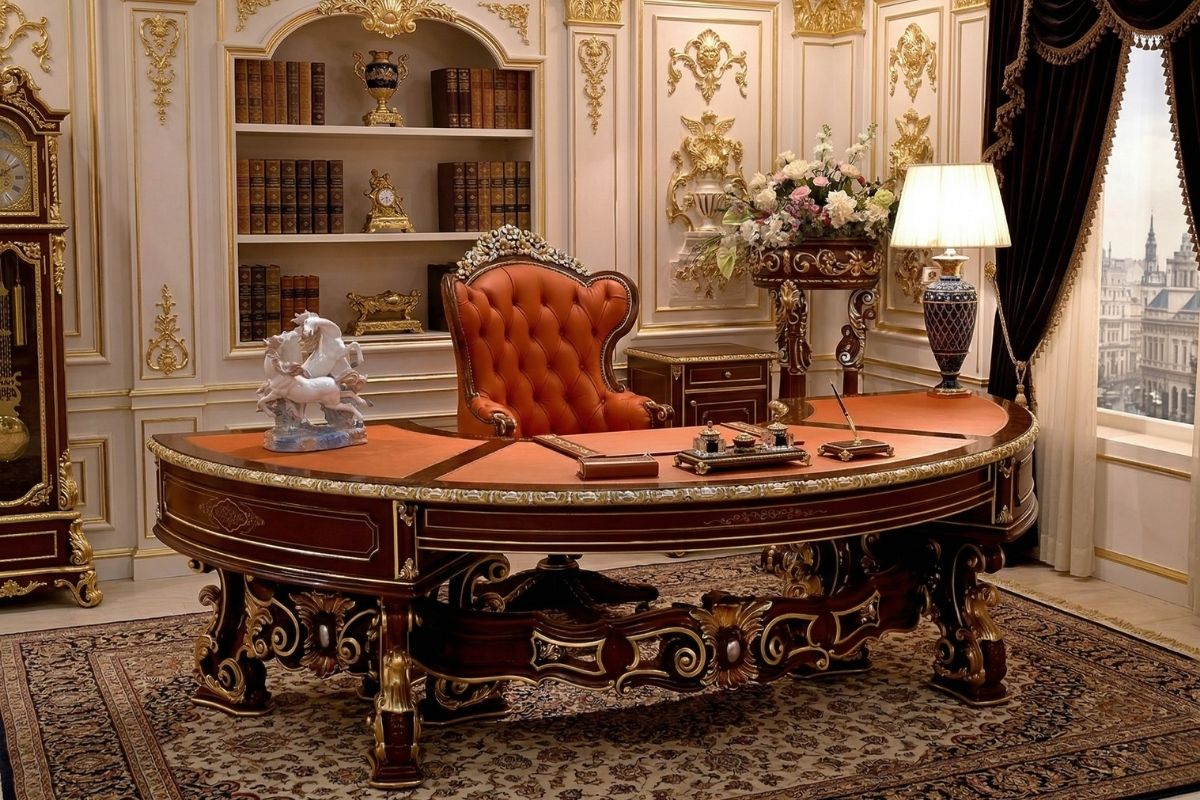 Versace motiflerinin yer aldığı geniş bir çalışma masasına sahip olan, çalışma odası takımı, en şık yaşam alanlarına hitap ediyor. Çalışma mekânlarında ceviz tonları ile altın varağın, yılların eskitemediği zarafetini yaşamak isteyen kullanıcılar için tasarlanan Sinerji klasik çalışma odası mobilyaları, sade ve şık tasarımı ile dikkat çekiyor. İhtişamlı bir kitaplıklı vitrin, zarif koltuklar ve alışılagelmişin dışında bir masa dizaynı ile çalışma alanınıza değer kazandıracak yepyeni bir tasarıma sahip. Sinerji çalışma odası takımı modeli, içindeki klasik çalışma masası, ön tarafındaki ilave masa eki ile daha kullanışlı bir hale gelmiş.