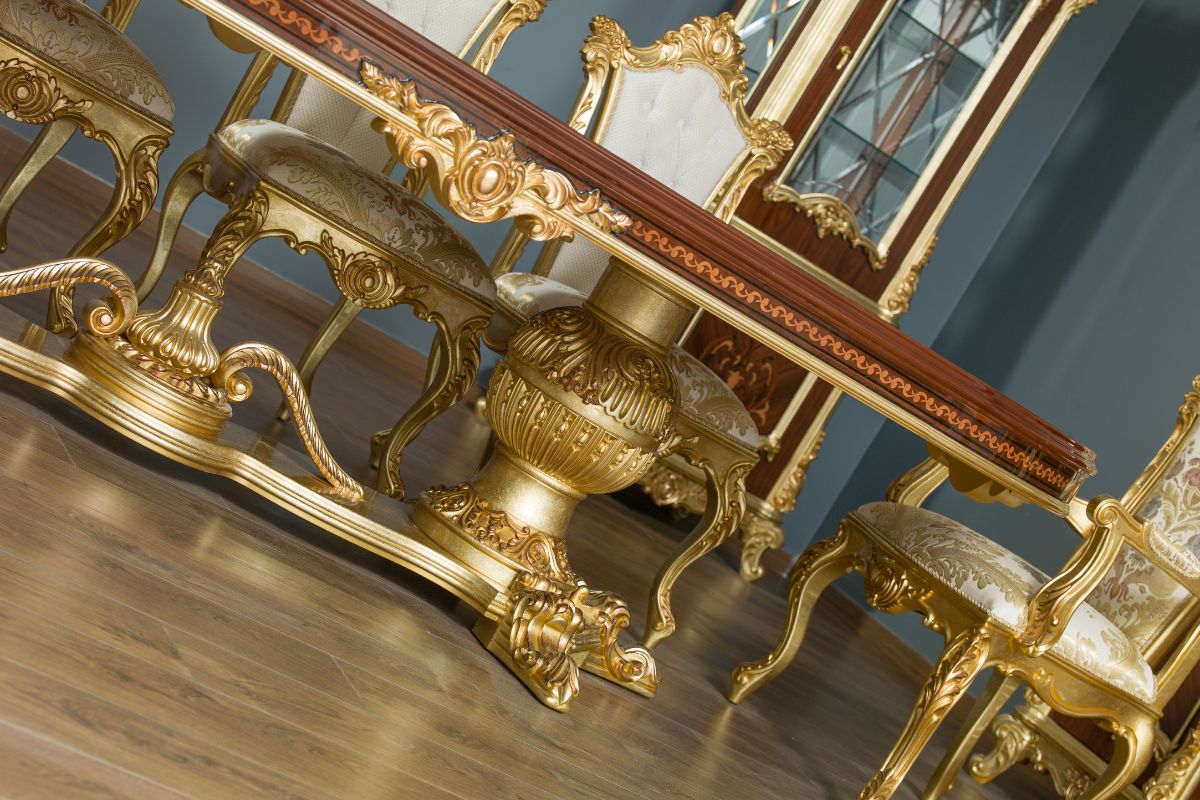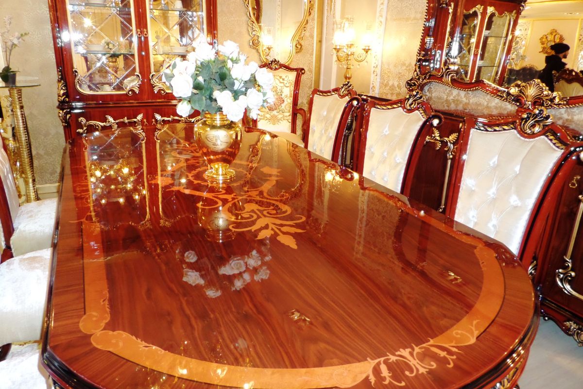 Oyma sanatının ince hatları göz alan, usta ellerin nakış nakış işlediği marküteri sanatının icra edildiği Karmen yemek odası takımı kullanıldığı alana yeni bir soluk getiriyor. Farklı renklerdeki ahşap kaplamaların kesilerek iç içe yerleştirilmesinden ve herhangi bir renklendirici madde kullanmadan, ağaçların yapısı ve renkleri ile birleştirilerek icra edilen marküteri sanatına sahip olan yemek odası takımı farklı havasıyla tüm görenleri büyüleyecek. Marküteri sanatının icra edildiği lüks yemek odası takımı tasarımının yanında, kullanışlı yapısıyla da beğeni topluyor. Klasik tasarım çizgisiyle tasarlanan Karmen klasik yemek odası takımı, ceviz ve altın renginin kombinlenmesiyle klasik konsept yaşam alanı isteyen kullancılar için dizayn edilmiştir.
